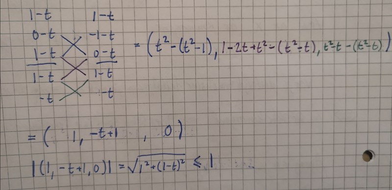 Enligt mina beräkningar kan alltså arean bli 0, vilket inte stämmer överrens med facit som säger 1/2. Vad har jag gjort för fel?