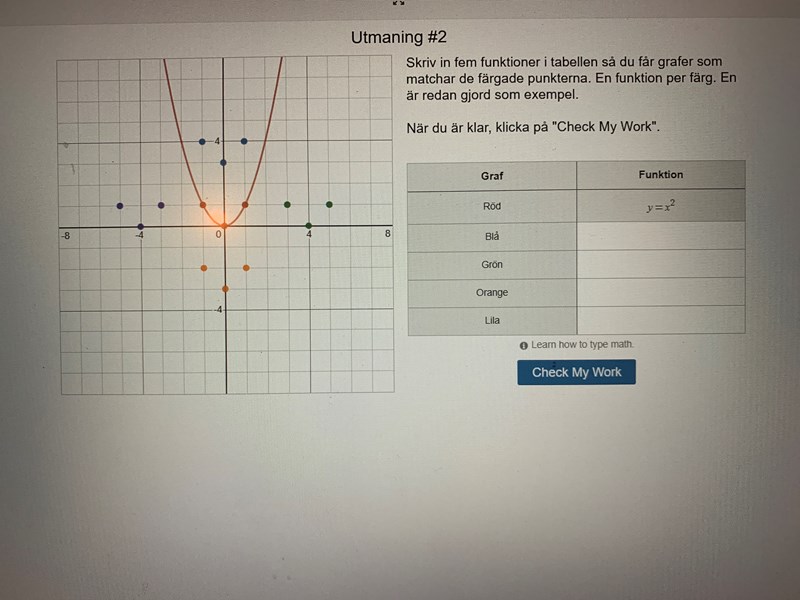 Ett sätt är att följande: Låt funktionen till höger vara . Eftersom grafen har samma form som (båda är glada munnar och båda har samma "skålning") så måste det gälla att koefficienten framför -termen är densamma i de båda fallen, dvs 1. Då vet du att . Eftersom du vet att symmetrilinjen ligger vid så kan du klura ut vad ska ha för värde. Sedan kan du bestämma genom att du vet att minimipunkten ligger på -axeln.