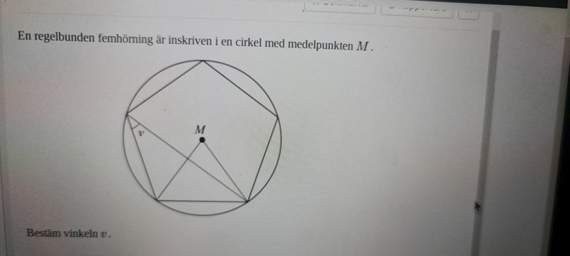 Alternativ lösningsmetod är att använda att femhörningens vinkel är 540°/5 = 108°. Den vinkeln är toppvinkel i en likbent triangel, där även två vinklar som är v ingår, vilket ger att