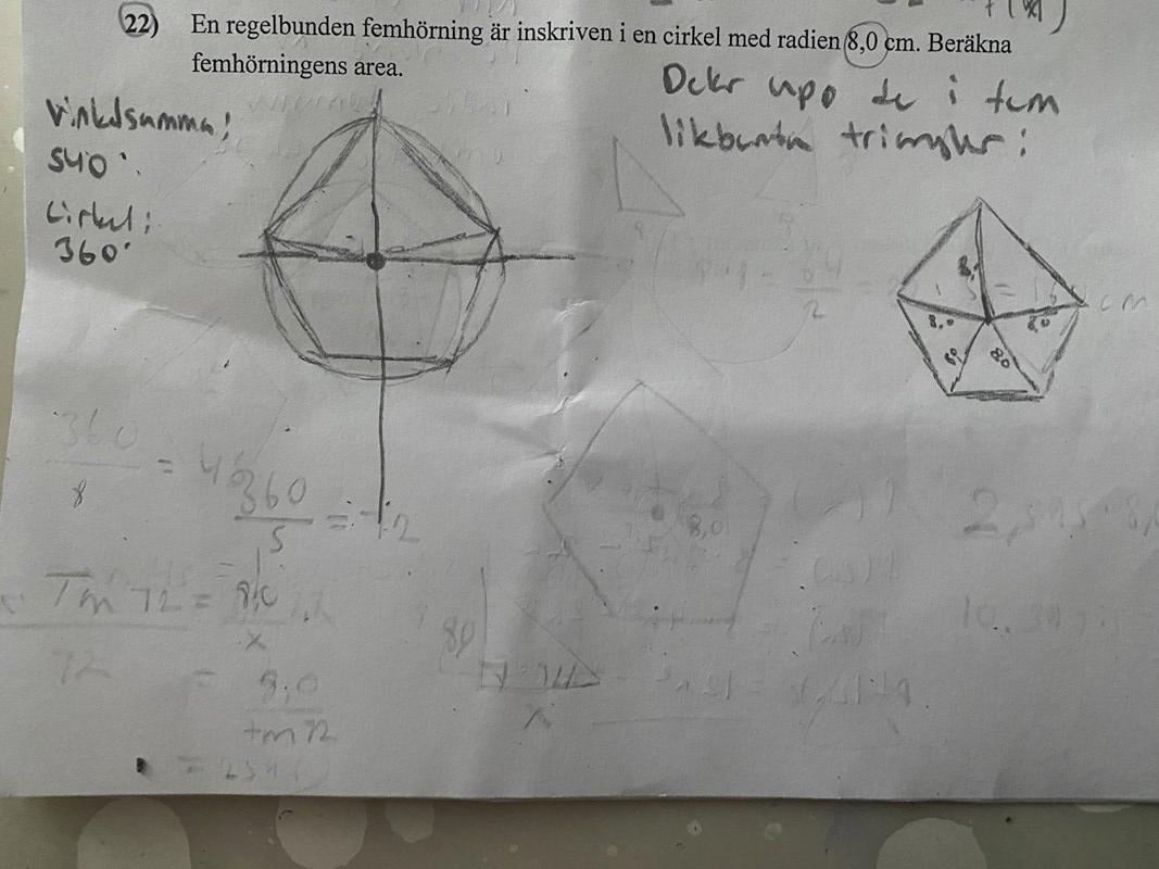 En regelbunden femhörning är inskriven i en cirkel med radien 8,0 cm. Beräkna femhörningens area.