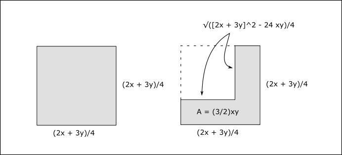 Men låt mig stega mig fram till en ny. Min idé är att börja med att definiera en parametrisering vars element är kvadrater som tillfredställer omkretskravet $$O(g(x,y)) = 2x + 3y $$ och därefter applicera "invikningsoperationen" på ett hörn tills dess att arean på ett sådant sätt att arean blir 1.5 xy då en sådan operation inte påverkar omkretsen.