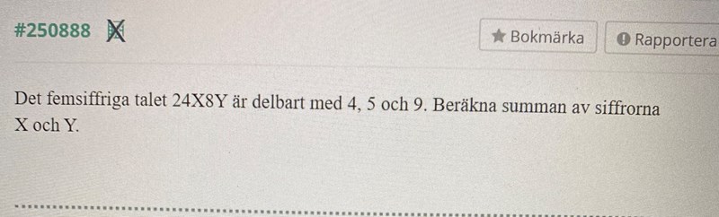 Siffersumma måste vara ett tal som är delbart med 9. Och Y måste vara 0 eller 5 för det ska vara delbart med 5. Om vi adderar 2+4+X+8+5= 19 och X ska vara 8 för siffersumma ska vara lika med 27 som är delbart med 9. Eller så ska X= 4 och Y= 0. Är det rätt?