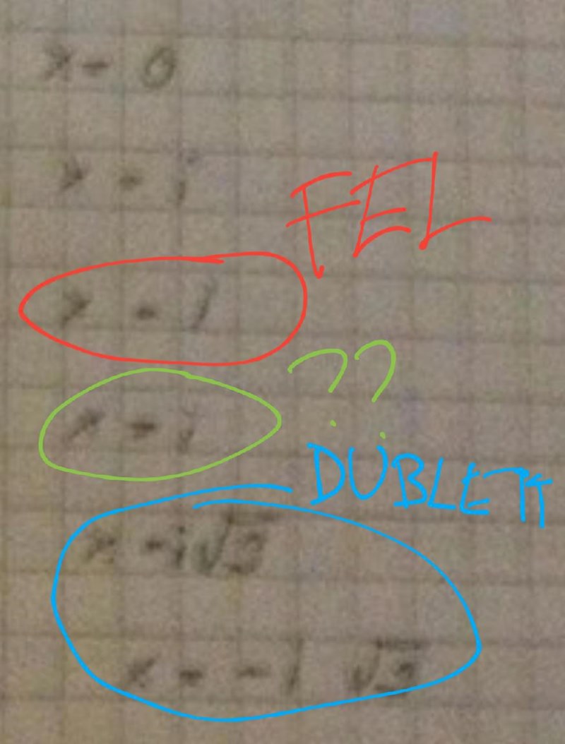 Om du tittar på . Tycker du det ser rimligt ut att du får lösningarna och ? Varför, varför inte? Du har uppenbarligen inte testat lösningarna i alla fall.