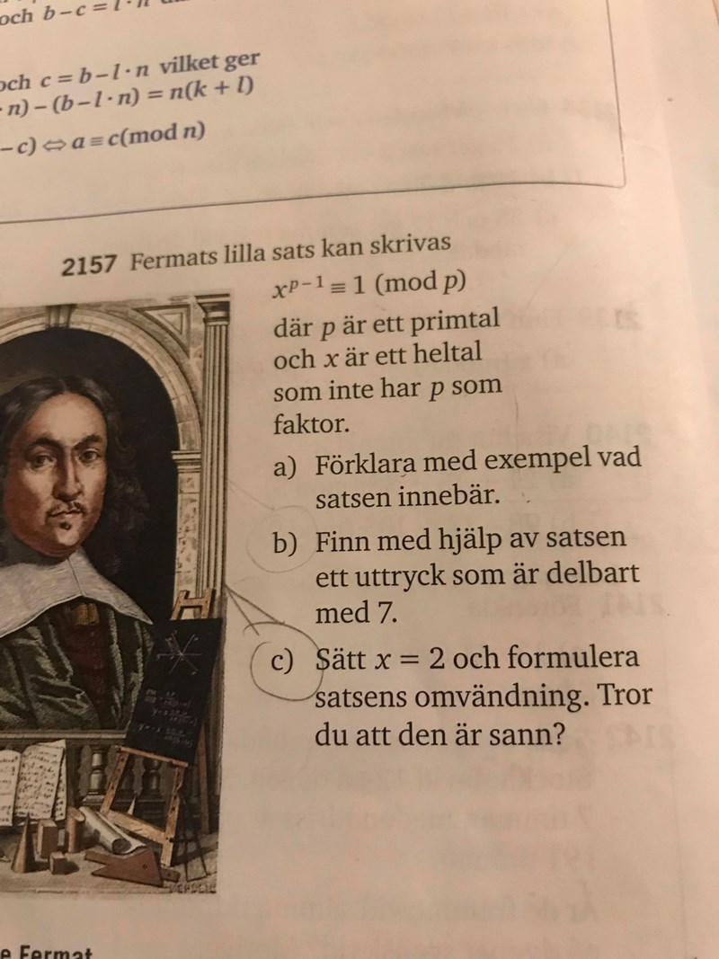 x^(p-1)=1 mod p (p är primtal) och (x är relativt prima med p).