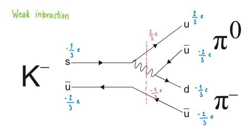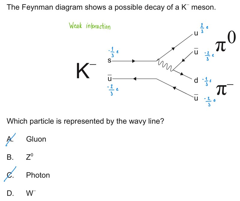 Jag förstår inte riktigt varför det bör bli W- tänkte att det är Z0 för att i just den stunden är laddningen (baryon nr) 0.