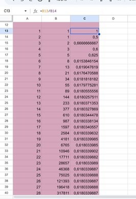 använda kalkylbladet som du skapade för fibonaccis talföljd. Bestäm i kolumn C kvoten av två på varandra följande tal i talföljden som du har beräknat i kolumn b. Vad händer med kvoten när n ökar?