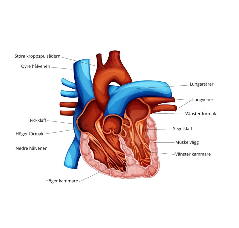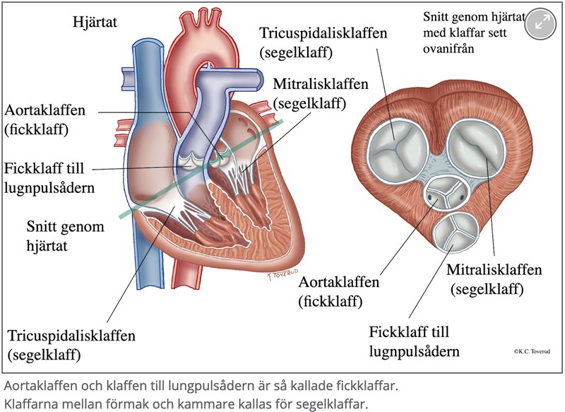 Mellan förmaken och kammarna finns istället segelklaffar som öppnas när kammarmuskeln drar ihop sig och pressar in blod in i kammaren. Och detta sker samtidigt som kammarmuskeln slappnar och blodets trycket i artären får fickklaffen att sluta sig. I bilden nedan från 1177.se syns det kanske lite bättre vad som är vad.