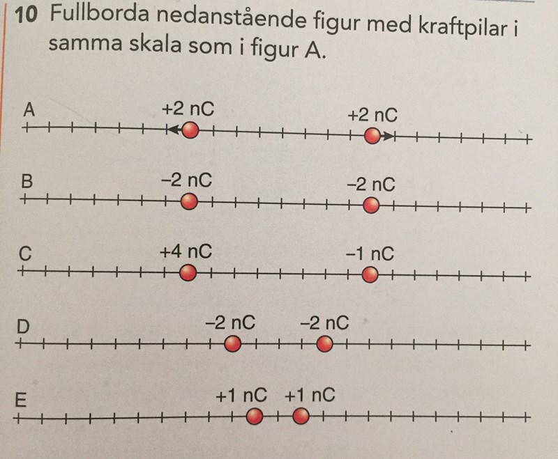 Jag har fastnat på denna uppgift. Uppgift B förstår jag, de repellerar varandra pga samma laddning och pilarna ska skrivas ut i samma skala som A. I C ska de attrahera varandra, därmed förstår jag pilarnas riktning, men skalan förstår jag inte, ska inte +4 nC täcka två delar på linjen (+2nC täckte ju en del) och då bör även -1 nC täcka en halv del? I sista uppgiften förstår jag att de ska repellera men jag har svårt för skalan igen.