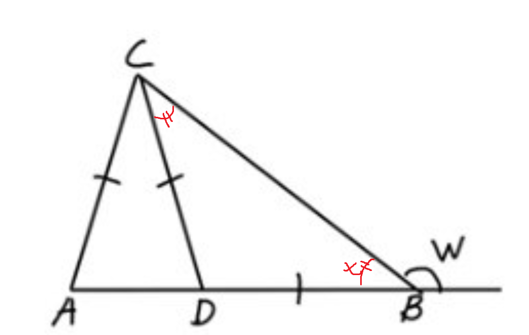 Jag har markerat en vinkel x som du lätt kan räkna ut. Eftersom CD och BD är lika, är BCD likbent. Det ger dig en annan vinkel gratis som jag markerat.