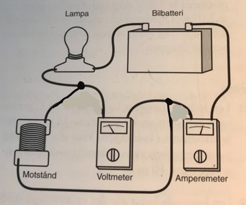 Jag tänker såhär: Det står i läroboken att voltmetern måste ha stor resistans, så att så lite ström som möjligt passerar igenom den. Därför ritade jag motståndet framför voltmetern.