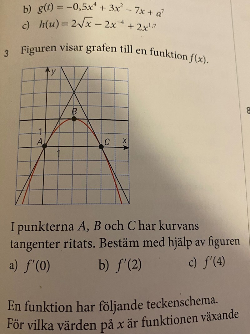 A och B är rätt, men lutningen för tangenten i C är nedåt, dvs negativ.