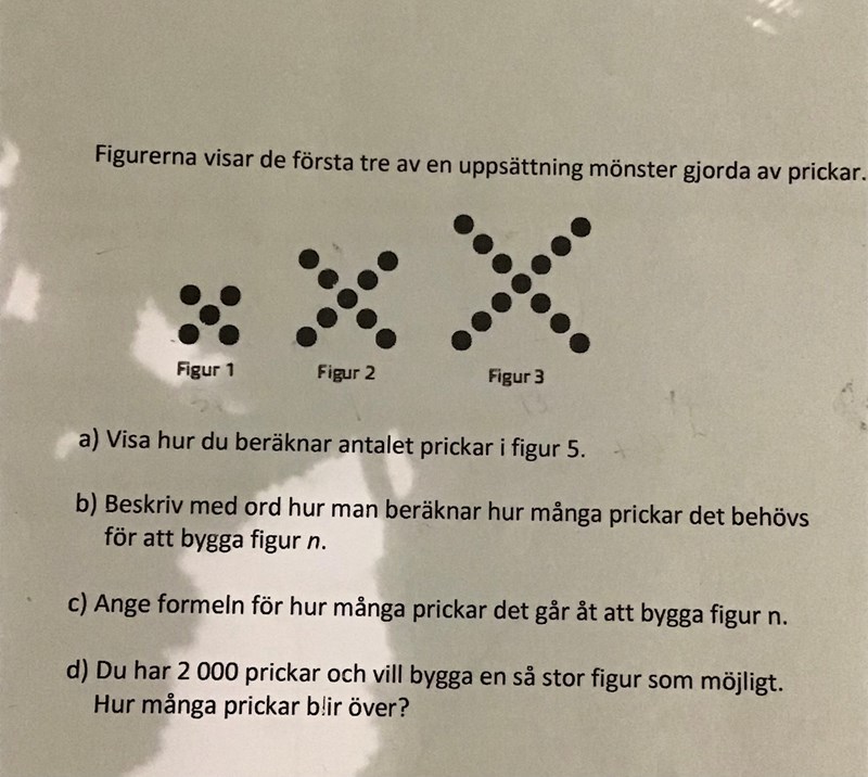 a) Det ökar med 4 prickar i varje figur. Figur 1 har 5 pickar, figur 2 = 9 prickar, figur 3 har 13 prickar osv. Figur fem är då typ 13 + 8 = 21. Alltså så är mitt svar att figur 5 har 21 prickar, och så har jag demonstrerat hur jag kommit fram till det.