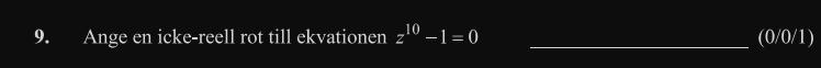 För att få en uppfattning om vad för rötter som finns och vilken du kan välja, så rita de tio enhetsrötterna i den komplexa enhetscirkeln. Det behöver inte vara exakt. (Enhetsrötterna är alltså de z sådana att zn = 1, här n = 10.)