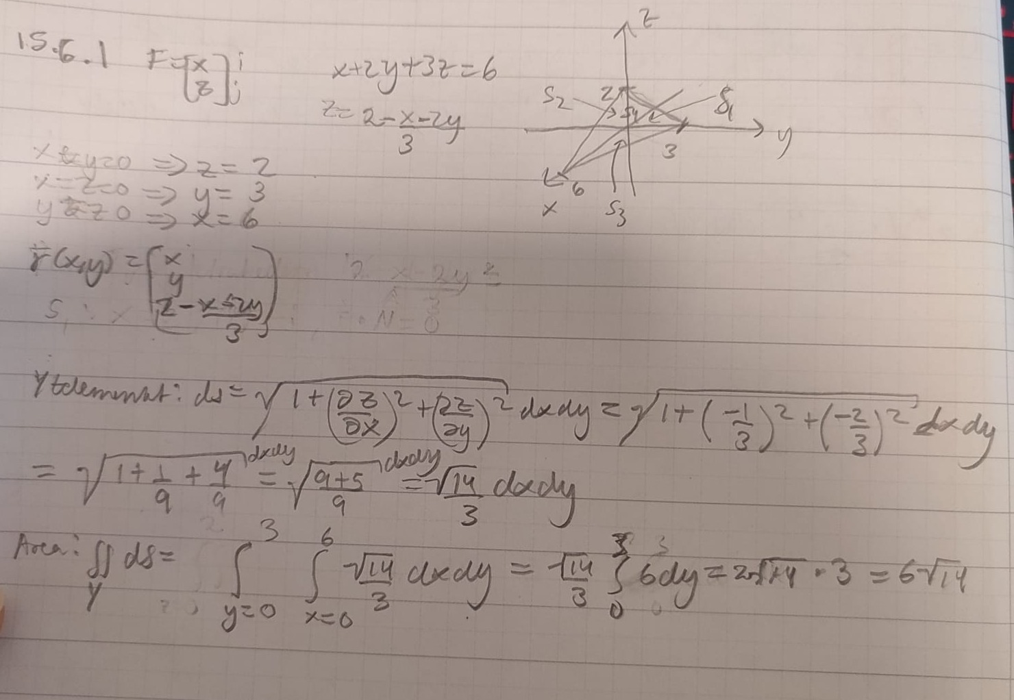 Du har tagit fram en parametrisering av ytan som bildar ett "tak" över ett triangelområde i xy-planet. Den stämmer förutom att det ska vara ett plustecken mellan och .