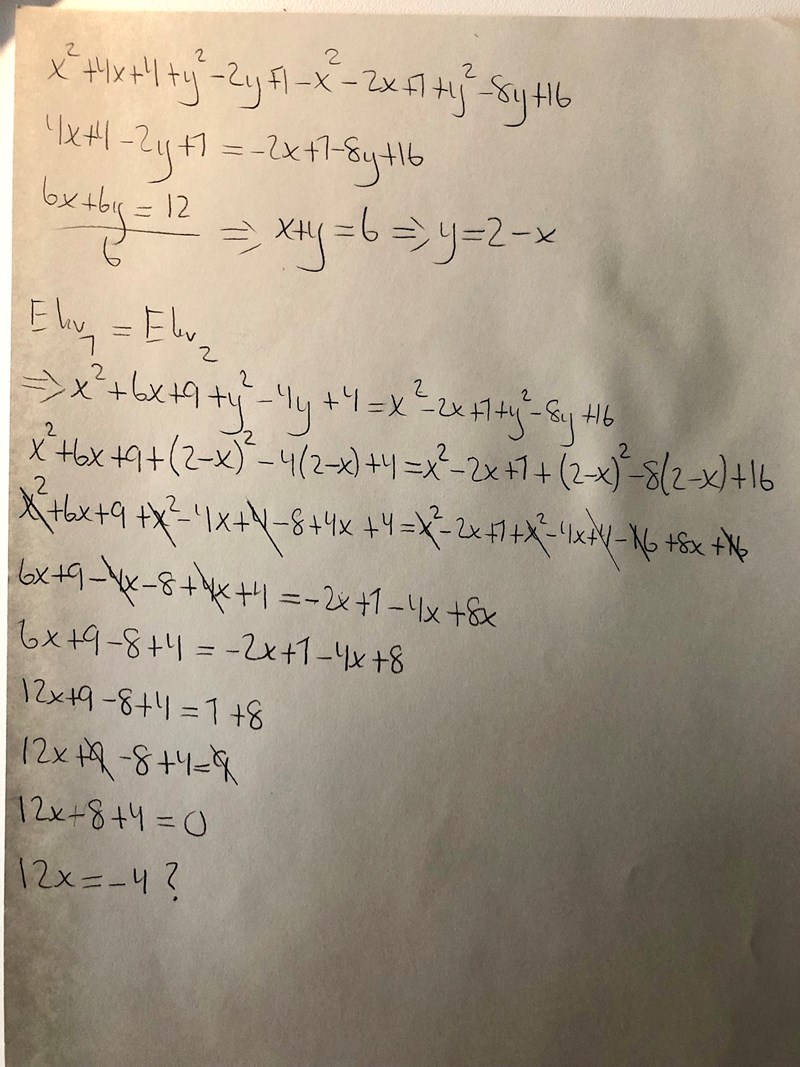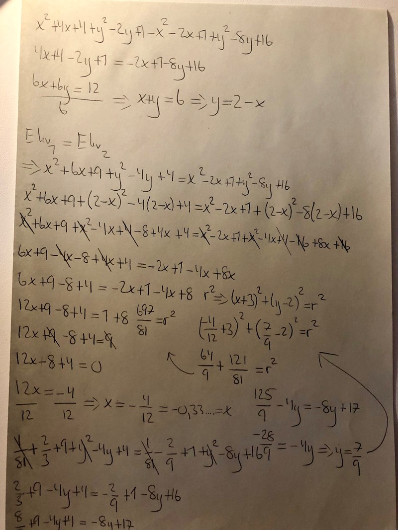 Nä, jag tänkte på det precis i början men jag tänkte att jag kunde lösa den rakt av algebraiskt men det var lite svårt. Jag har i alla fall tagit ekvation 1 och 2 och satt dem lika då båda är lika med r^2. Det ser ut såhär: som jag då försöker förenkla i och med att det finns flera termer som tar ut varandra: som i sin tur leder vidare till ekvationen: Är jag på väg mot ljusare tider eller gräver jag bara ner mig djupare? Min magkänsla säger att det är korrekt.