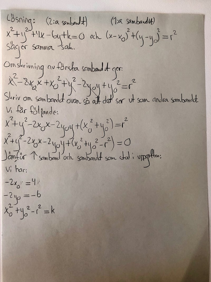 Allt detta som jag bifogar nu skrev Yngve. Jag har däremot inte bara skrivit ner det utan steg för steg verkligen försökt förstå vad som tillhör vad... Jag hade lite svårt att se vad mitt (k) var i alla skrivna samband men nu har jag förstått. Jag vet däremot inte vad jag ska göra med mina nedersta tre kända värden? Ska jag nu ta dessa värden och ersätta x respektive y med dem? 🤦♀️