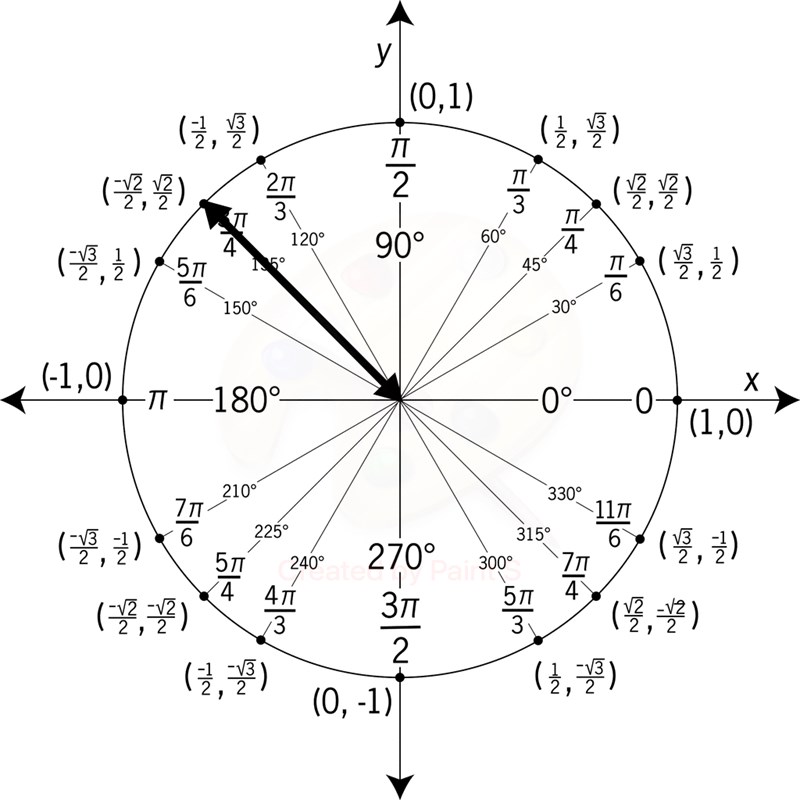 - Du har kommit fram till resultatet att vinkelns cosinusvärde är det negativa talet . Ritar du in den lodräta linjen i ett xy-koordinatsystem, där du även ritat in Enhetscirkeln, ser du att linjen skär cirkeln i två punkter vilka motsvarar två vinklar och (radianer) vars cosinusvärde är .