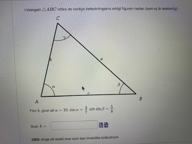 Hej jag ska finna sidan b i triangeln och har följande uppgift: