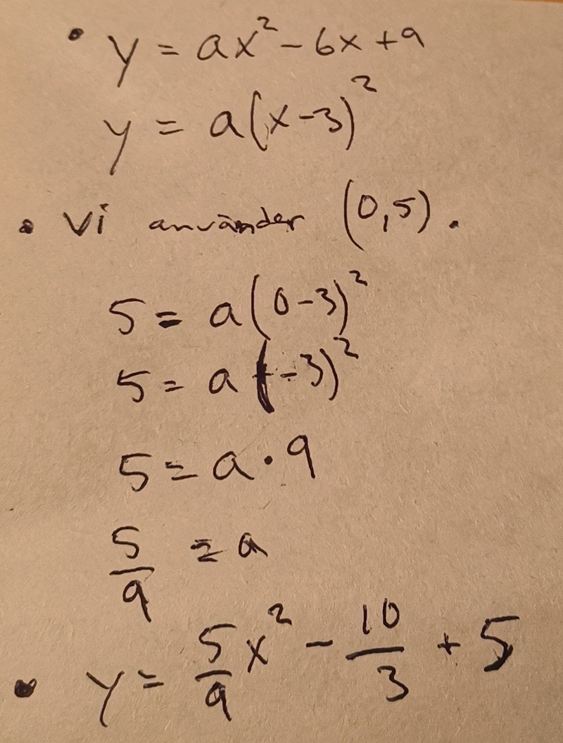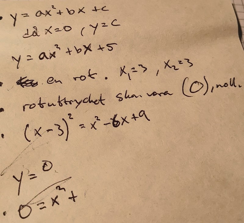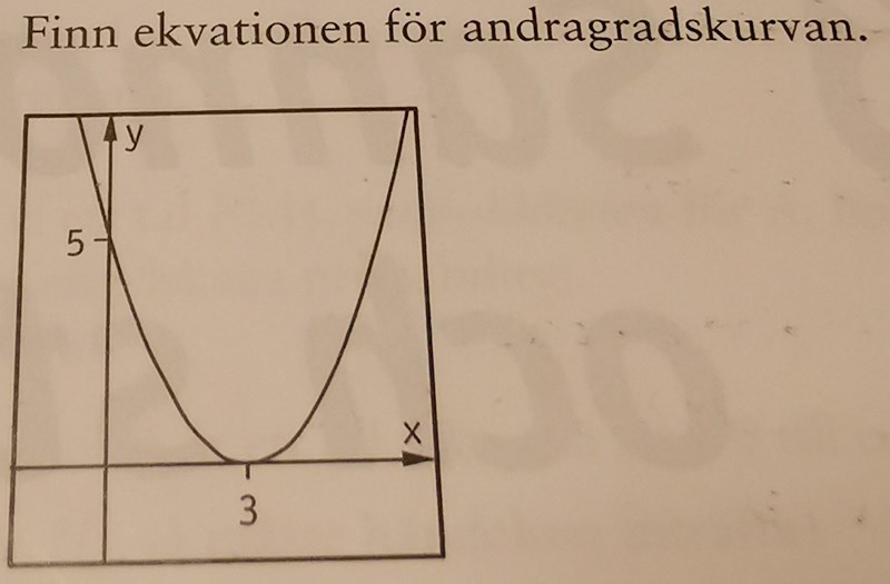 Du tänker rätt! Funktionen ska ha en dubbelrot då x=3x=3, vilket innebär att två faktorer ska vara (x-3)(x-3), som du har skrivit (y=(x-3)2). Det som fattas är bara en faktor k, som vi bestämmer så att funktionen skär (0, 5):