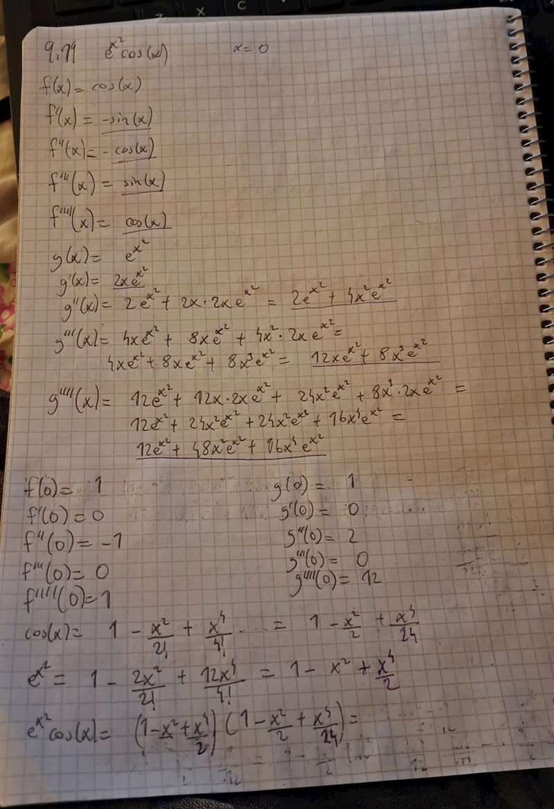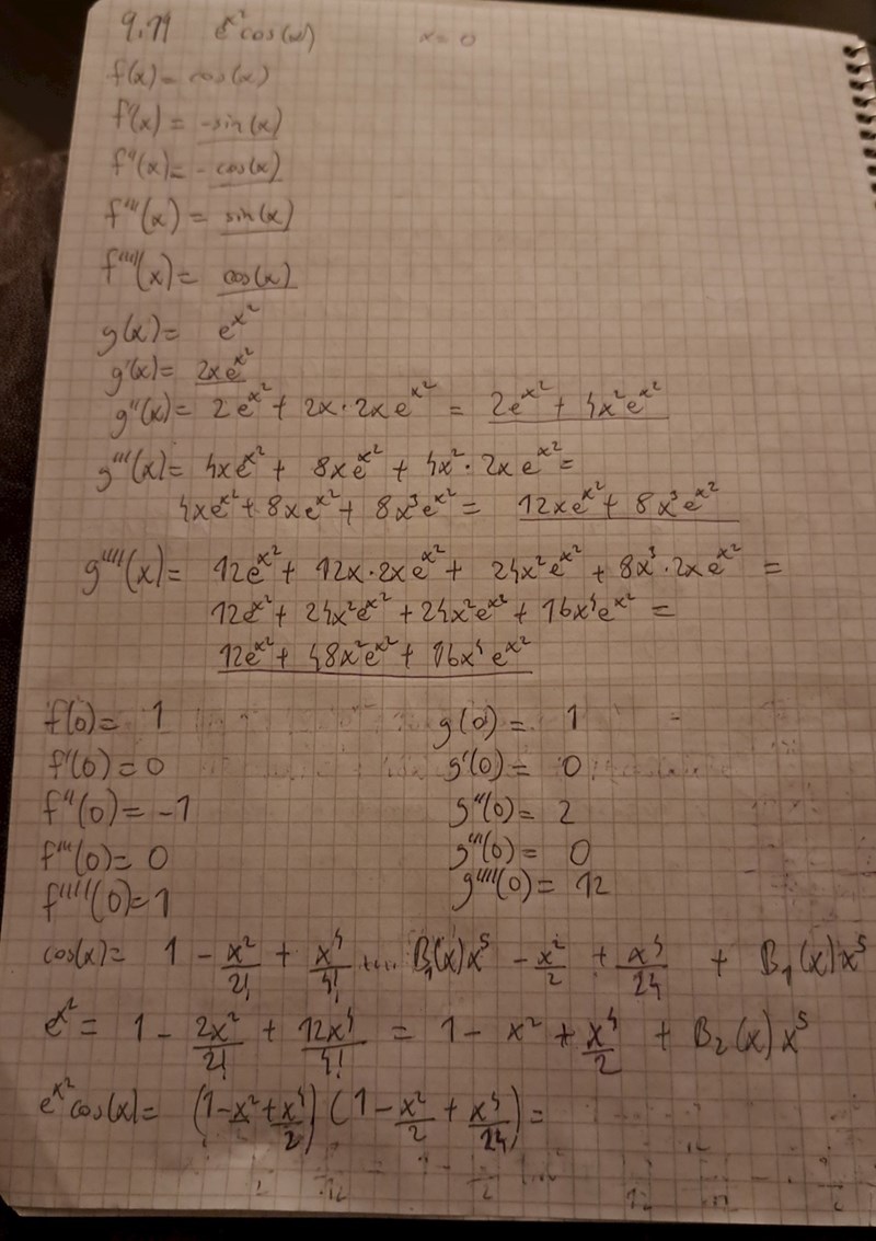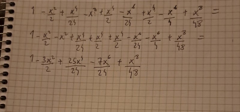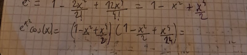 cos(x) ex^2 = 1 + x2(1–1/2) + x4(1/2–1/2+1/24) + x6(–1/720+1/48–1/48+1/6) +…
