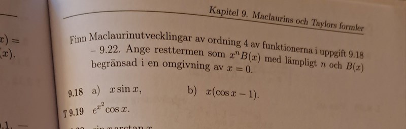 Jag fattar verkligen ingenting nu. Du gjorde det bara ännu mer förvirrande. Uppgiften säger tydligt att vi ska maclaurin utveckla vid fjärde ordningen och du går iväg till sjätte ordningen som du fortfarande ej kan förkara för mig varför. Av någon okänd anledning substituerar du x^2 mot t och det säger du ej varför. Du pratar om restterm och om jag tolkar din text rätt så menar du den där B1n(x) som jag skrev i min bild. Jag tänker ej komma ihåg en massa härledningar förrän jag fått svar på mina frågor.