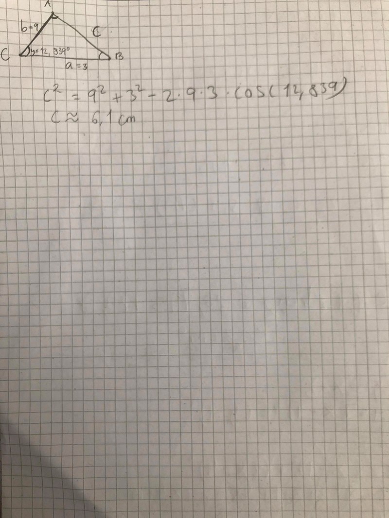 Finn c, givet att vinkeln ∠C är spetsig och a=3, b=9 och sinγ=2/9.