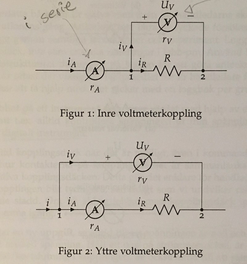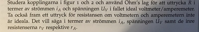 A) r_a är noll så ingen resistans där, och r_v oändlig så ingen ström går därigenom. Alltså fås i båda fallen: i=i_a=i_r och spänningen över motståndet är Uv, alltså, R=U_v/i_r