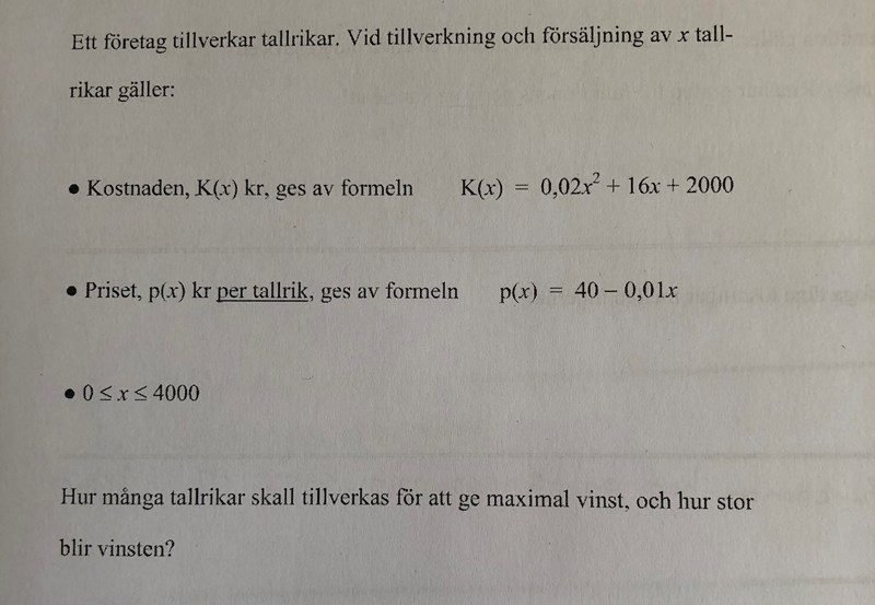 Jag ska räkna ut maximal vinst. Vinsten V borde vara V(x)=priset-kostnaden. Jag tänker mig ju att jag ska finna största möjliga värde för V och att jag gör det genom att jämföra extrempunkterna och ändpunkterna och se vad som ger största funktionsvärdet. Jag måste dock ha gjort nått fel men fattar inte vad.