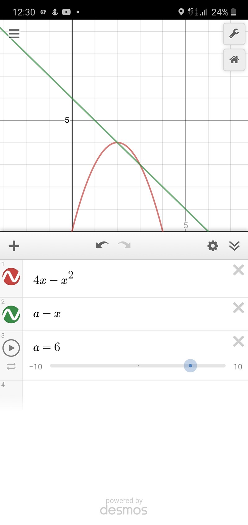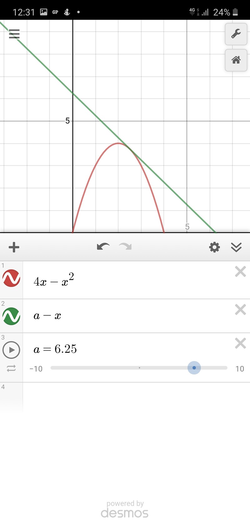 Det känns ändå som att min uträkning var rätt... förstår inte varför facit säger a > 6,25. Har det något att göra med att linjen inte bara skär i extrempunkten, utan kan också skära den böjda kurvan? Att det därför inte räcker med a > 6? Hur ska jag då räkna? Vill gärna göra det algebraiskt.