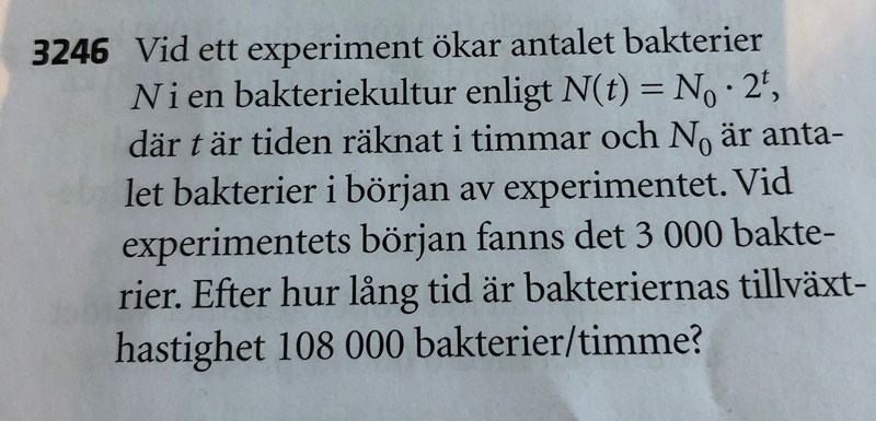 jag tar att N(t) = 3000 •2^t•ln2 =6000^t•ln2 men det blir ändå fel när jag sedan ska räkna ut.
