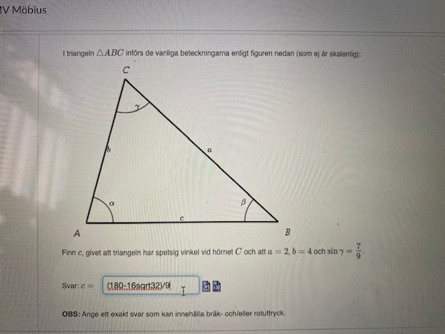 Hej, jag ska lösa vad sidan c är i triangeln. Har gjort på följande vis: