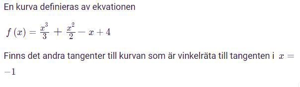 är du klar för nu har du bevisat att det finns 2 ställen på kurvan där tangenten är vinkelrät mot den 1:a tangenten. Så svaret på frågan är alltså "Ja".