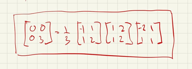 Jag fick exakt såhär med matris multiplikation bara att jag har 0 0 0 3. Det är samma sak. Det var dock en del arbete för att komma dit. Men istället borde man inse att egenvärdena utgör diagnol och resten är nollor