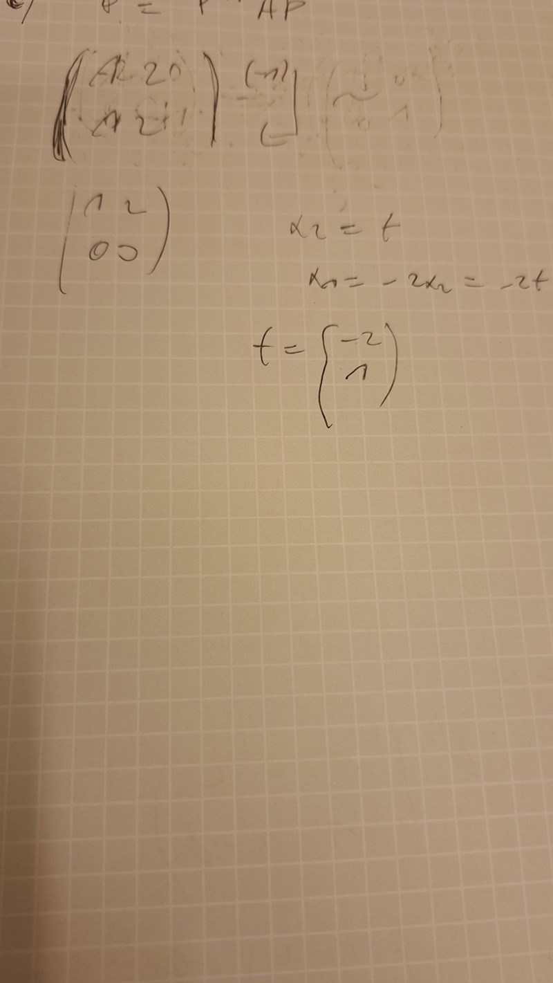Mogens skrev:Väldigt länge sedan, men jag får egenvektorer (–2 1)^T och (0 1)^T till egenvärdena 0 resp 2.