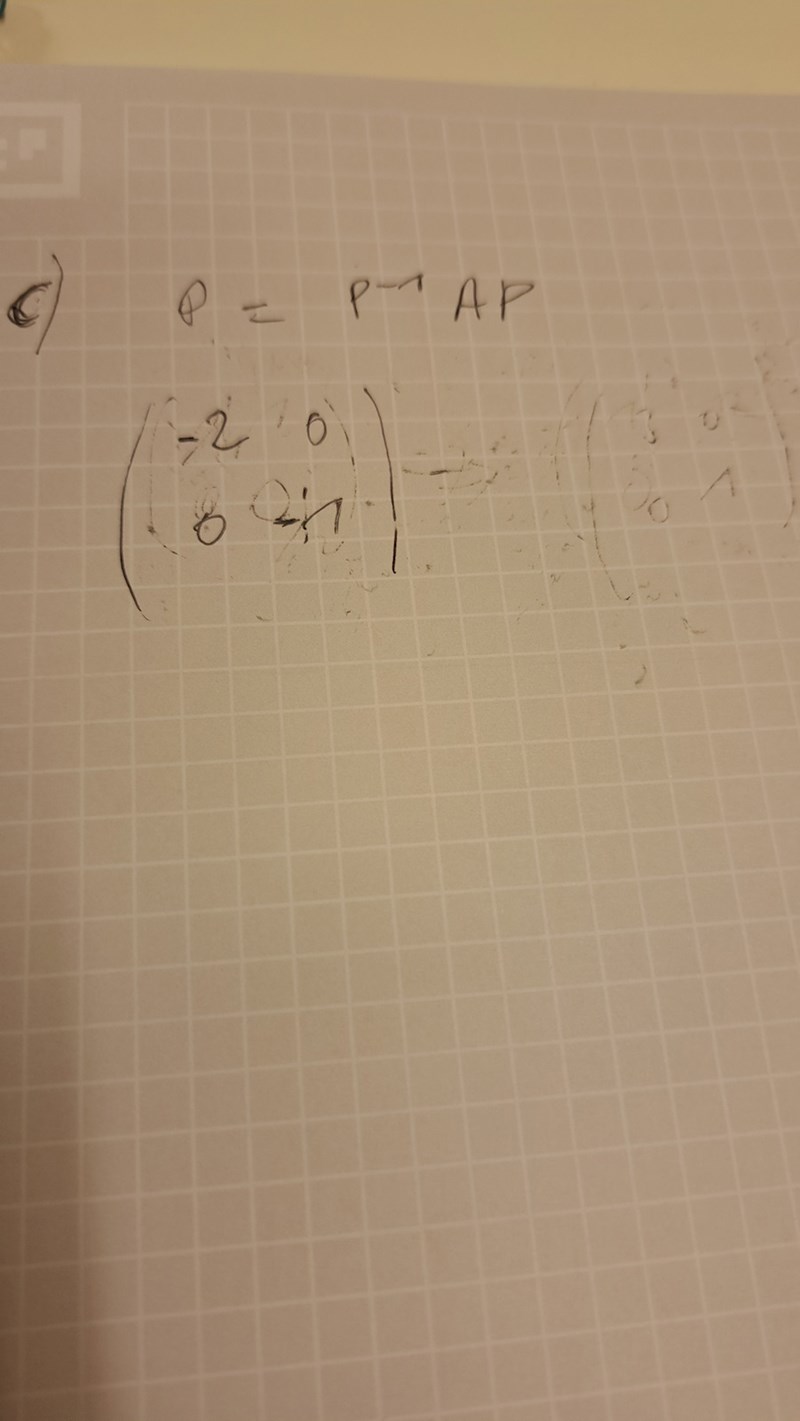 P är det här mha egenvektorer vi fick i a) uppgiften. Så jag behöver ta fram inversen P och sen räkna ut diagonalen. Men jag vet ej om jag ska gausa för att få D eller om det är matrismultiplikation som gäller?