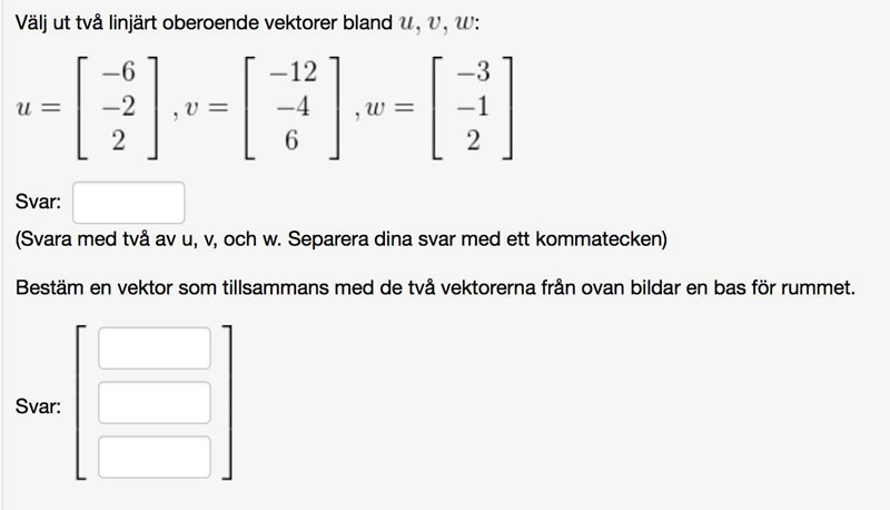 u=-231-1 u = -2\begin{pmatrix}3\\1\\-1\end{pmatrix} och v=-262-3 v = -2\begin{pmatrix}6\\2\\-3\end{pmatrix} och w=-31-2 w=-\begin{pmatrix}3\\1\\-2\end{pmatrix}