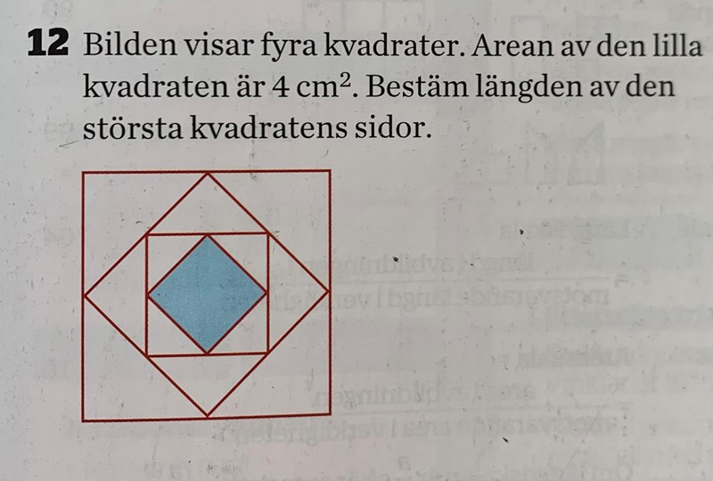 Jag började med att ta roten ur 4 för att veta längden på den lilla kvadraten, 2 cm. Sedan har jag använt Pythagoras sats för att beräkna längden av kateterna på nästa triangel, vilket blir hypotenusan på triangeln "utanpå" den. Jag har sedan fortsatt att göra så och fått svaret ≈ 5.6 cm.