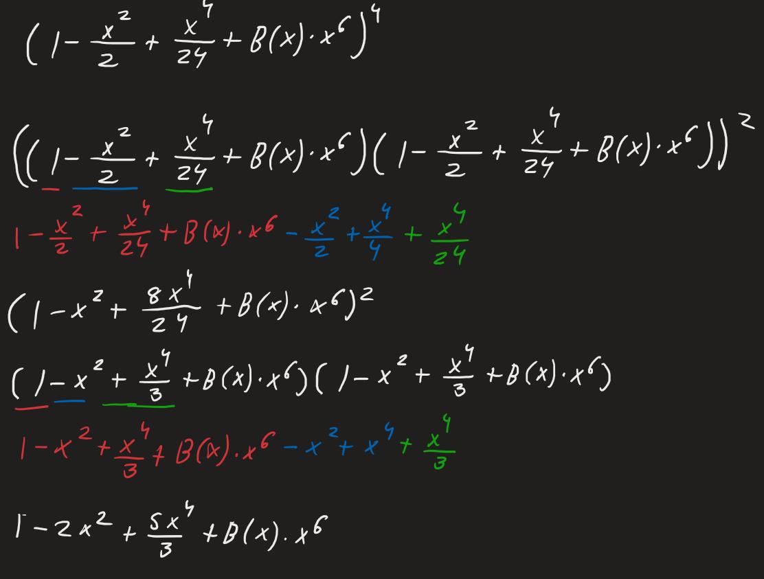 Micimacko skrev:Utveckla bara cos till grad 4, och upphöj utvecklingen direkt. Typ (1-x2/2+x4/24+O(x5))^4.