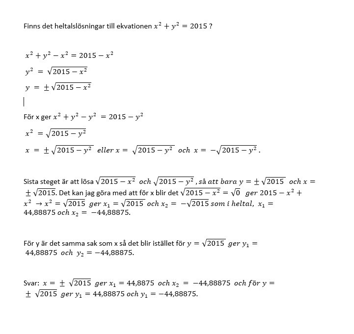 Jag tror att det finns inte heltal för x^2+y^2=2015. Jag tror att man ska använda modulus 4 för talen 2015 så att resten blir 3. Men för modulus har inte läst om det.