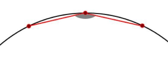Man kan tänka grafiskt också. Gemensamt för regelbundna polygoner är att de kan skrivas in i en cirkel. Så välj en punkt på cirkeln, med en grannpunkt på varje sida, på samma avstånd. Dessa tre punkter motsvarar varsitt hörn i månghörningen. Vad händer med vinkeln när punkterna förs närmare varandra?