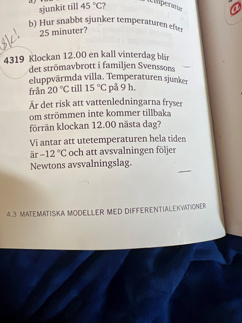 Lasse Vegas skrev:Newtons avsvalningslag säger att temperaturförändringen för ett föremål är proportionell mot skillnaden i temperatur mellan föremålet och omgivningen. Om husets temperatur är y grader C så är omgivningens temperatur den temperatur utomhus vilket är -12 grader C. Skillnaden i temperatur blir då y - (-12) vilket förenklas till y + 12.