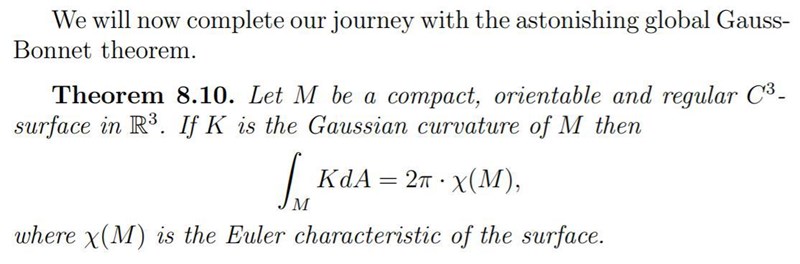 (För den som är nyfiken på att lära sig mer om detta så finns det ett helt avsnitt av podcasten My Favorite Theorem som är dedikerat till Gauss-Bonnet, och som är ganska lättebegripligt även om man är ny på detta med differentialgeometri.)
