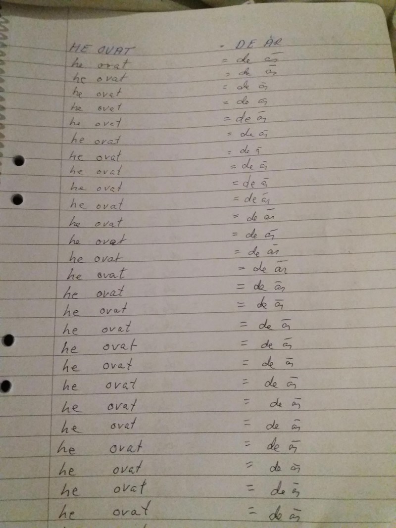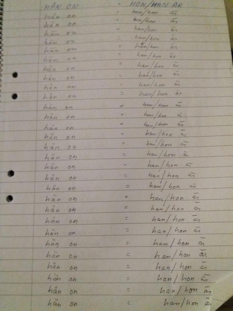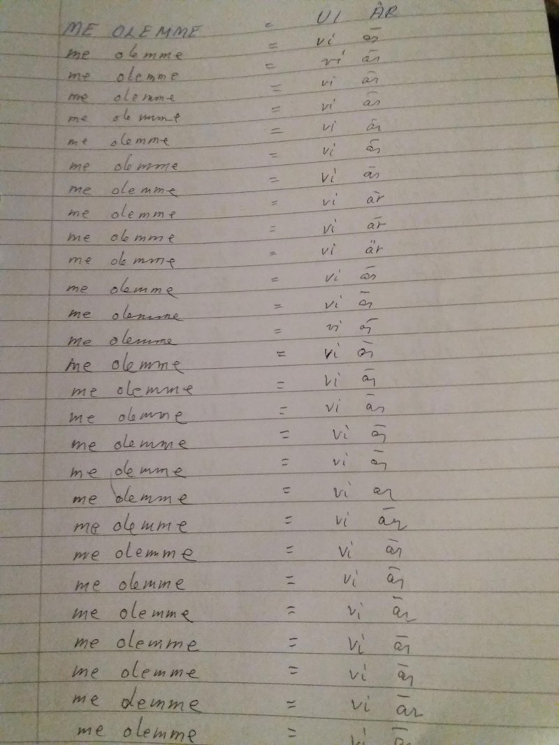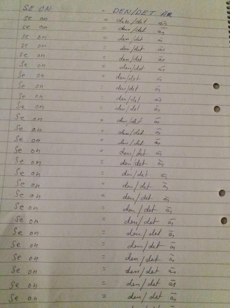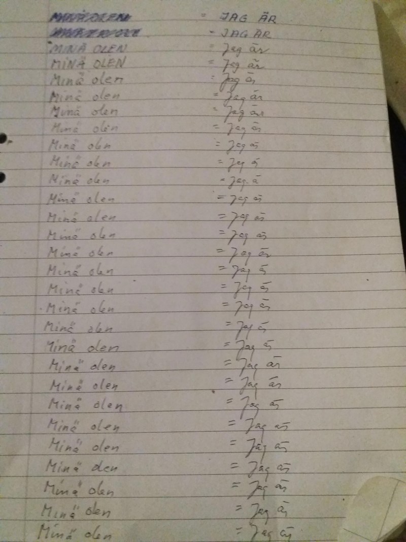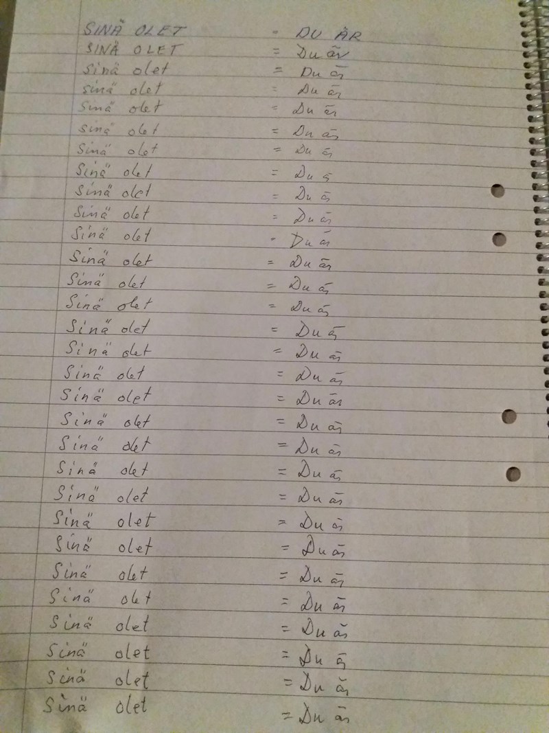 Jag försökte lära min sambo finska eftersom han var intresserad av det. Han fick hålla på tjata om pronomen. Han fick skriva samma ord en hel sida för att få det fästa.