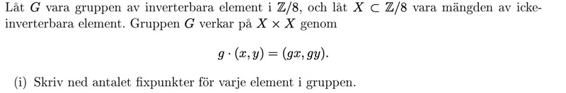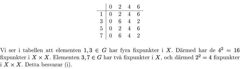 Jag förstår inte hur elementen 1,3 ∈ G har fyra fixpunkter i X och hur elementen 3, 7 ∈ G (obs! ska det inte vara 5,7?) har två fixpunkter X. Hur ska man tänka när man tittar på tabellen?