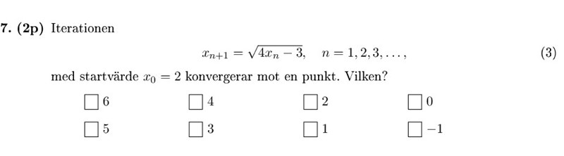 Vid 2 ökar värdena och vid 4 minskar de, alltså är det 3 som är iterationens konvergensvärde givet alternativen.