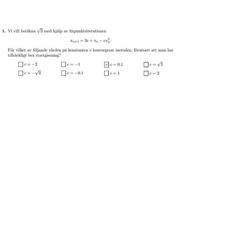 c = 0 är en lösning, men det är ingen bra lösning, för då är xn+1=xnx_{n+1} = x_n, dvs. x ändrar sig inte alls. Det kan ju vara bra om x har rätt värde, men det ändrar sig inte om det har fel värde heller, så itereringen är värdelös.
