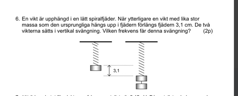 Utifrån informationen att fjädern förlängs med 3.1cm (i jämvikt) när man hänger på den ytterligare vikten så får du ett samband mellan viktens massa m och fjäderkonstanten k. Detta samband kan du sedan utnyttja för att beräkna frekvensen hos pendeln med massa 2m och fjäderkonstant k när den sätts i svängning (dvs dragits ut från sitt jämviktsläge och släpps)