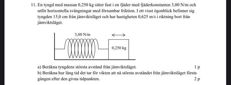 Den givna tidpunkten är den som beskrivs i frågan: "I ett visst ögonblick befinner sig tyngden 15,0 cm från jämviktsläget och har hastigheten 0,625 m/s i riktning bort från jämviktsläget."