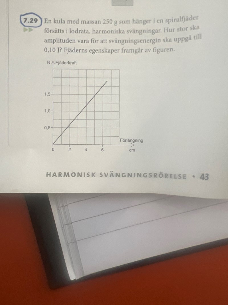 En kula med massan 250g som hönger i en spiralfjäder forsätts i lodräta, harmoniska svängningar. Hur stor ska amplituden vara för att svängningsenergin ska uppgå till 0.1J? Fjärderns egenskaper framgår av figuren.