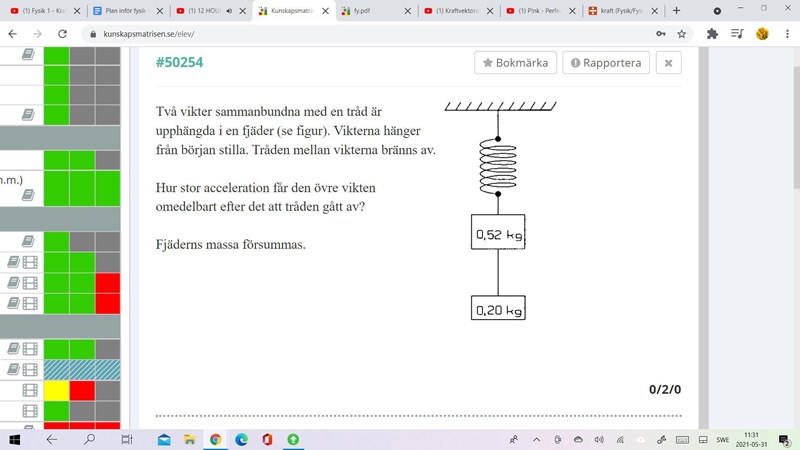Vår lärare brukade säga att skippa uppgifter med fjädrar men vi lär få de i skolverksprovet ändå, så hur ska jag tänka här? Delade en ganska likanande uppgift nyss, hur bör man tänka ifall jag t.ex får fram kraften hur räknar jag ut accelerationen? 0,2 * 9,82???